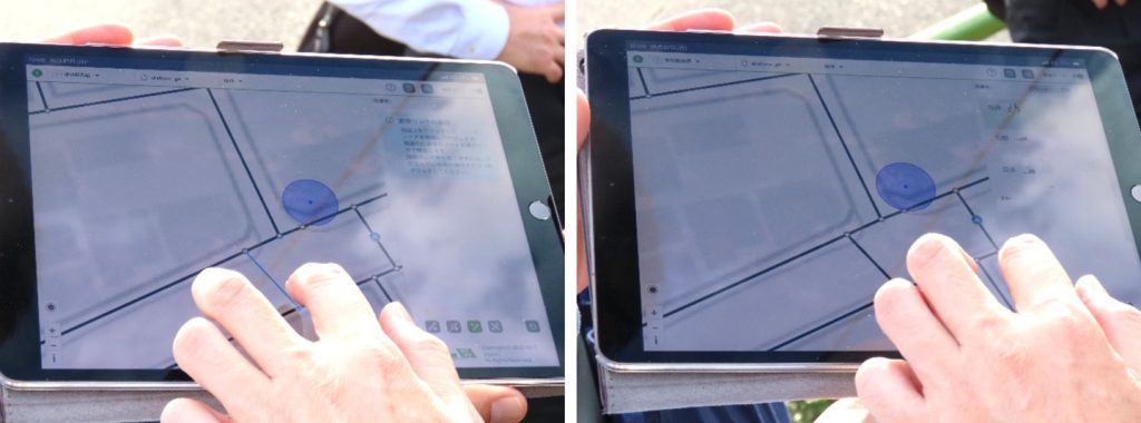 システム上の形状データが現状と異なる箇所や、データが不足している箇所については、参加者自らがタブレットを操作してリンクやノードの追加・修正を行う作業も行われました(上図)。