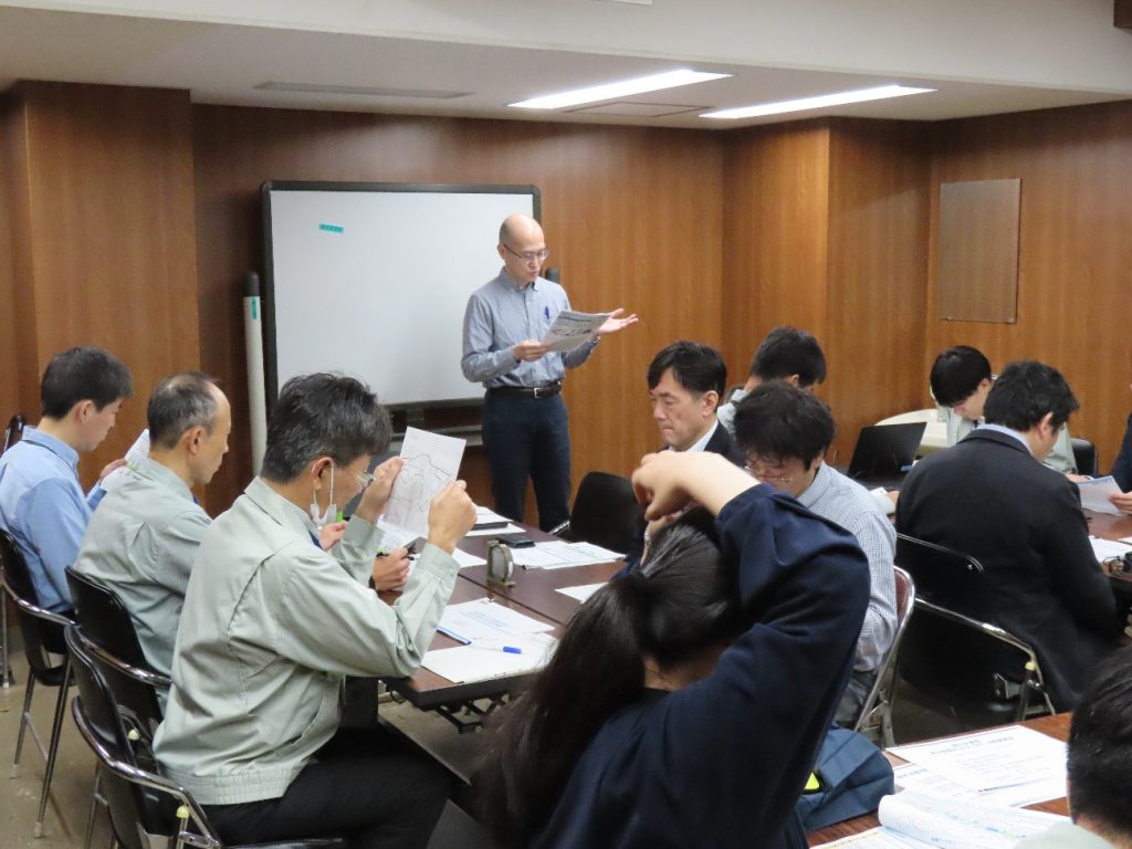 実証当日は、まず午前に室内での説明と実習が行われました。株式会社パスコの高塚氏による進行のもと、参加者は4つのグループに分かれてプロジェクトの全体像やデータ構造(リンクとノード)について説明を受け、その後、データ整備の核となる2つのシステムについて実習が行われました。