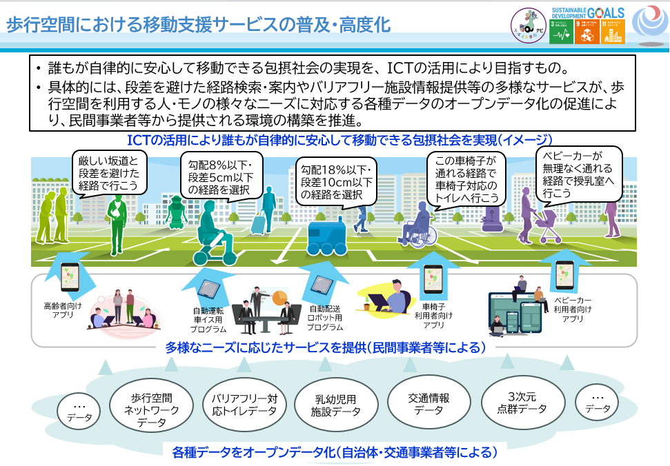国土交通省では、2014年(平成26年)からICT(情報通信技術)を活用した歩行者移動支援の普及促進に取り組んでいます。従来の地図ナビゲーションサービスでは「段差」や「勾配」といったバリア情報が不足しており、高齢者や車いす利用者、ベビーカー利用者などが安心して移動できる環境が十分とは言えませんでした。