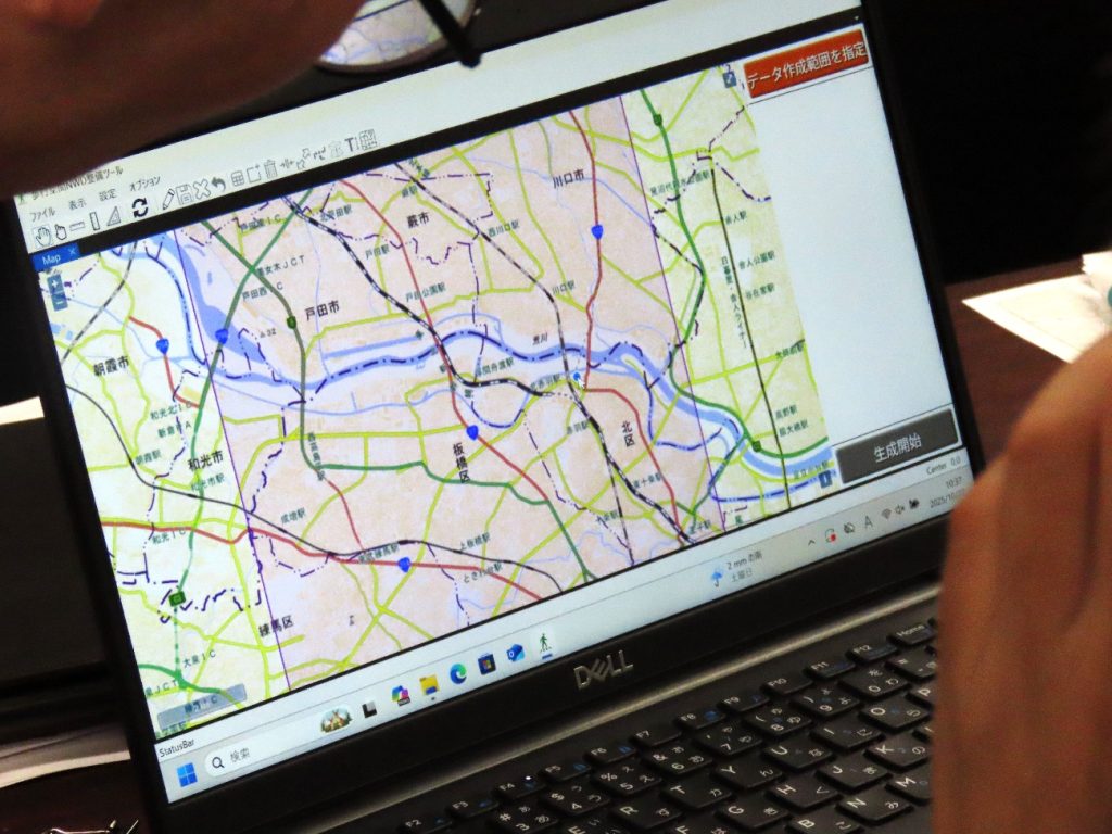 今回の実証では、PCで自動生成された形状データ(歩道のネットワークデータ)が、あらかじめタブレット端末のシステムに登録されています。