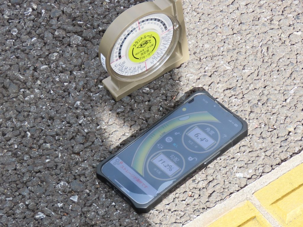 現地調査では、参加者はこの地図上に表示された「リンク」(経路)を実際に歩き、バリア情報を確認します。主な作業は、リンクごとに「幅員」「縦断勾配」「段差」をコンベックス(メジャー)や傾斜計、またはスマートフォンの傾斜計アプリで計測することです。