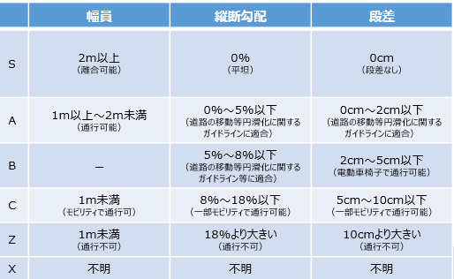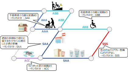 そして、その計測結果を「ランク区分」に当てはめます。例えば、「幅員2m以上(S)」「縦断勾配5%以下(A)」「段差2cm以下(A)」であれば、そのリンクのランクは「SAA」としてシステムに入力されます。