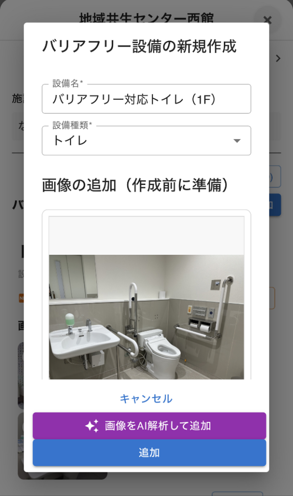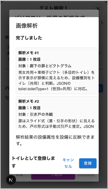 抽出された情報はバリアフリー設備のデータに反映され、事実と異なる項目があれば手動で編集し、一連の作業が完了します。