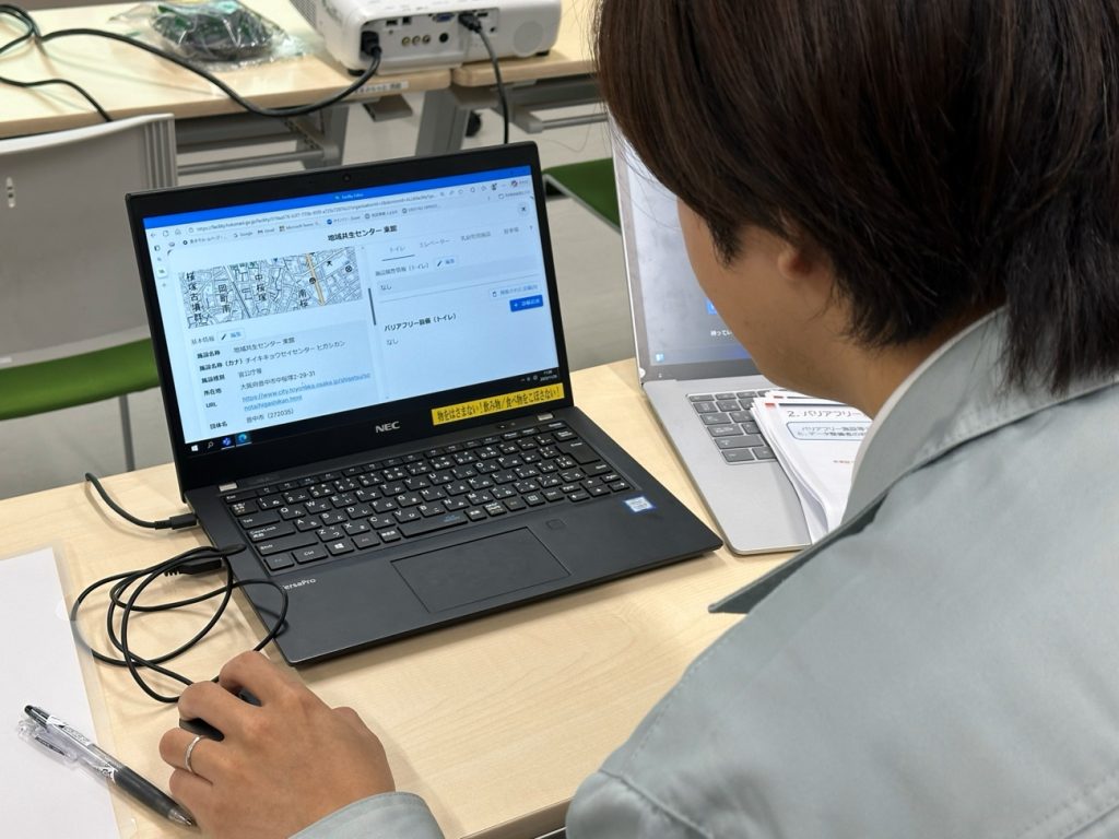 午前の実証には豊中市職員が参加し、バリアフリー施設等データの構成やシステムの操作方法、現地調査における留意点等について研修を受けました。本実証では、豊中市がオープンデータとして公開している既存の施設データを、事前に事務局側でフォーマット変換を行い、システムに取込んでからスタートしています。取込みには生成AIが活用されており、参加者は実際にPCにてシステムを動かし、取込みデータが正しく反映されているかの確認や編集作業を体験しました。