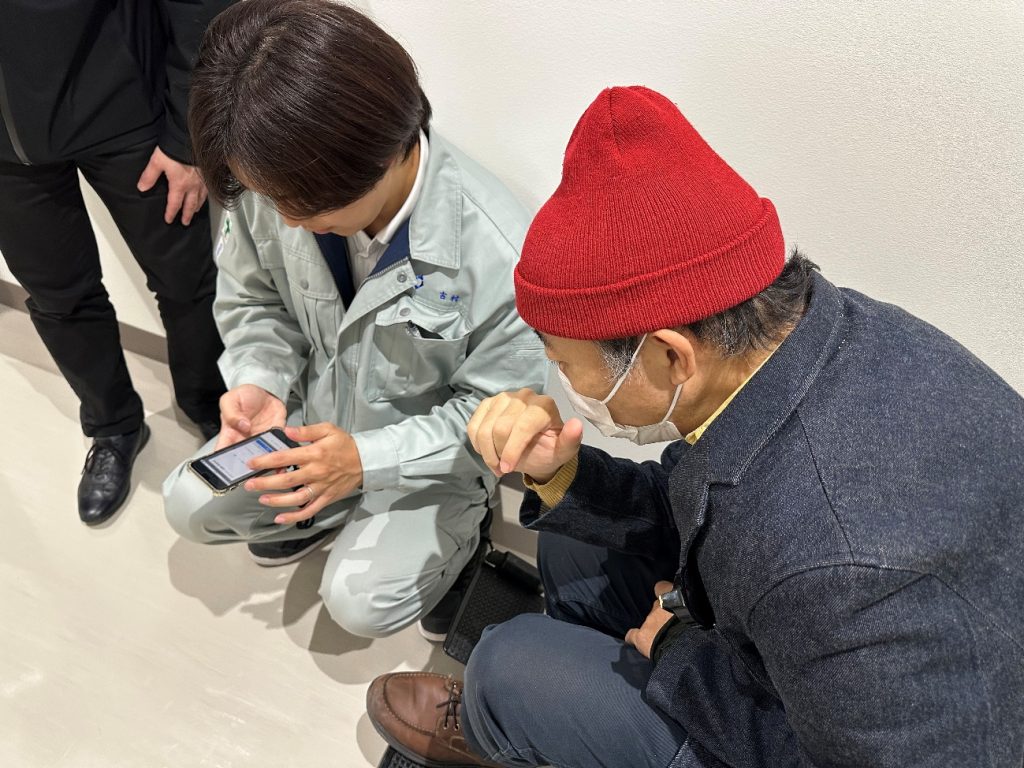 午後の実証では、市民ボランティア6名も加わり、3チームに分かれてデータ整備の対象施設(豊中市役所第一庁舎・第二庁舎、地域共生センター西館・東館、岡町駅)を訪問。スマートフォンを用いてバリアフリー設備を撮影しながら、本実証の肝であるAI画像解析による設備自動抽出と、抽出した情報に基づくデータ整備を行いました。