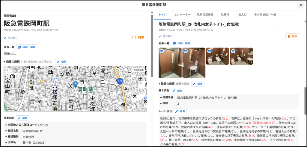 PCでのバリアフリー施設等データ整備システムの編集画面(例:岡町駅)