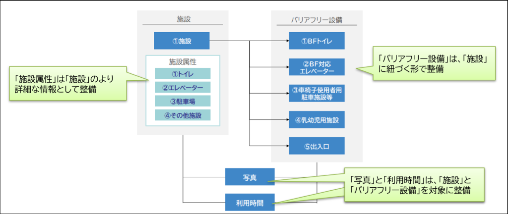 ・「バリアフリー設備」…施設内にあるバリアフリートイレ、バリアフリー対応エレベーター、車椅子使用者用駐車施設等、乳幼児用施設、出入口の詳細情報をまとめたデータ