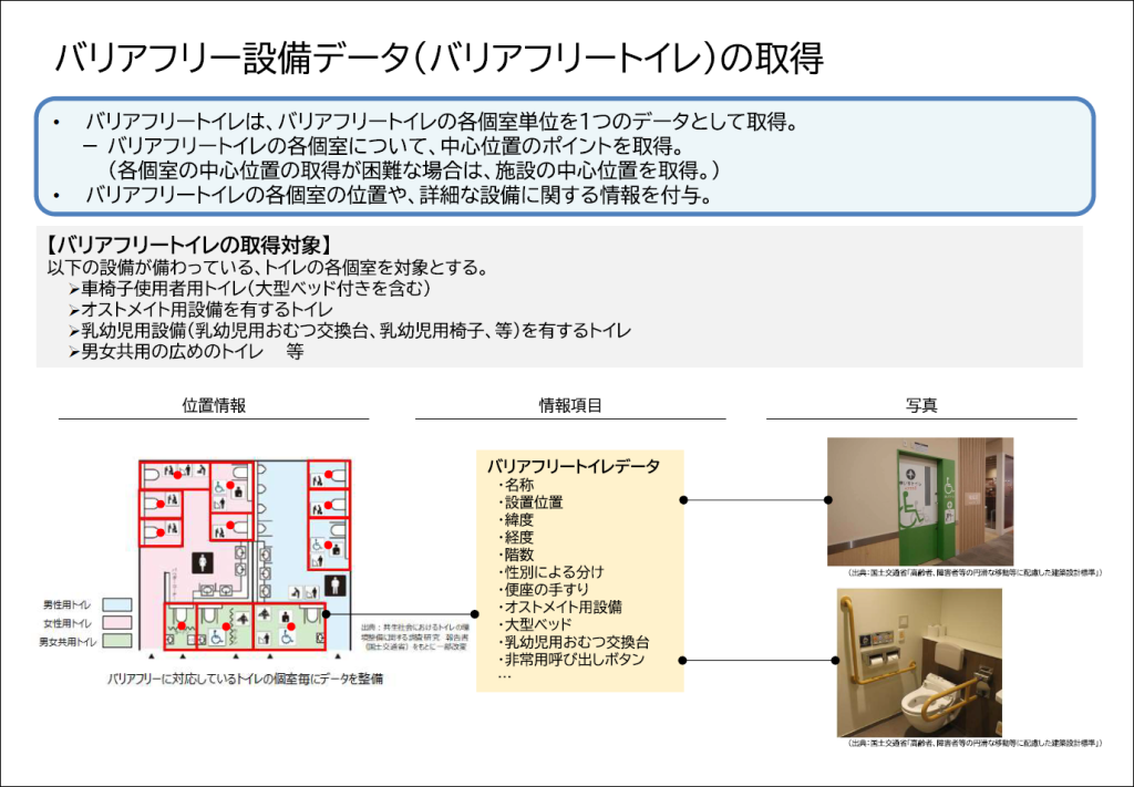 「バリアフリー設備」データ(バリアフリートイレ)のデータ取得に関する資料。